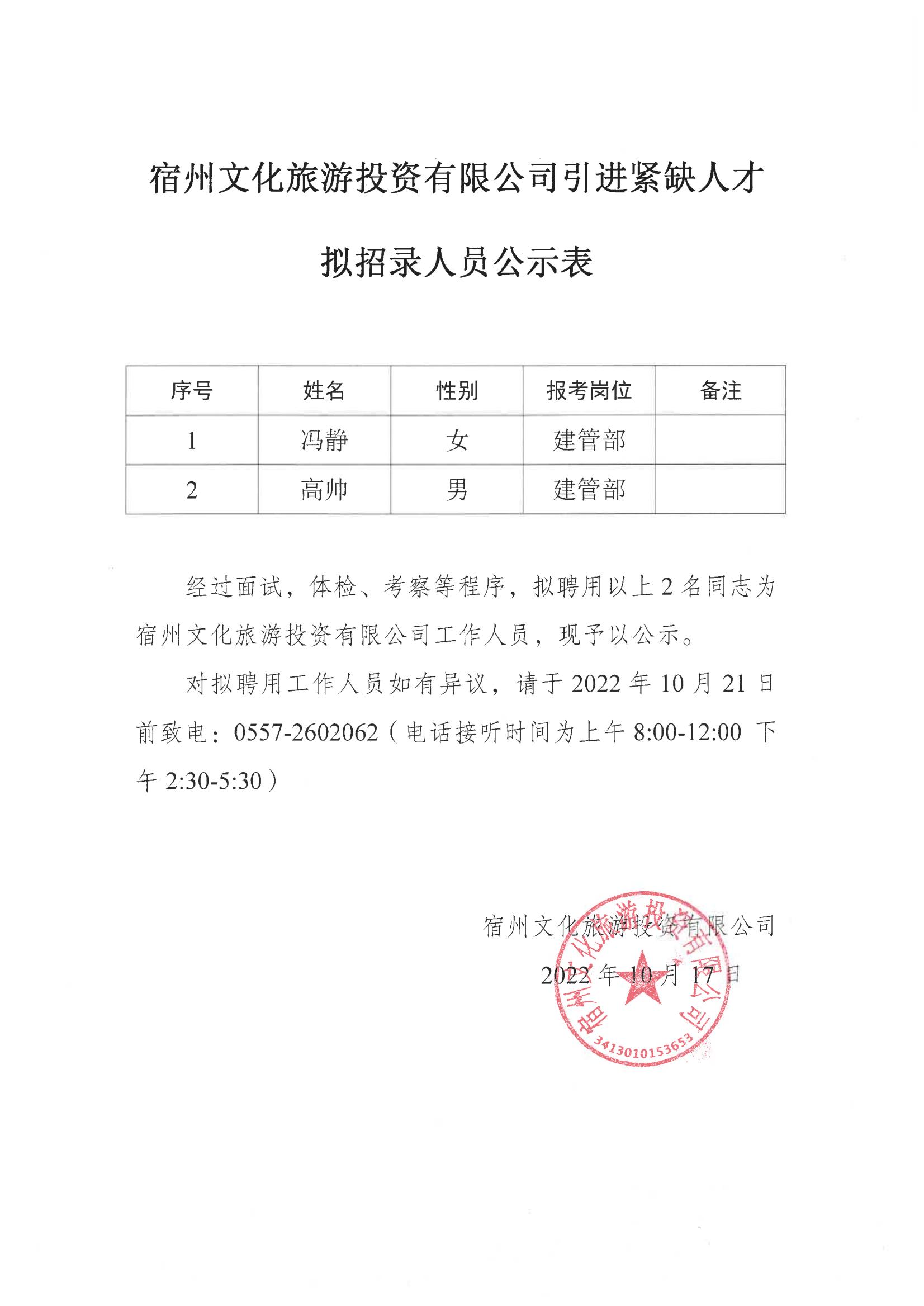 宿州文化旅游投資有限公司引進(jìn)緊缺人才 擬招錄人員公示表